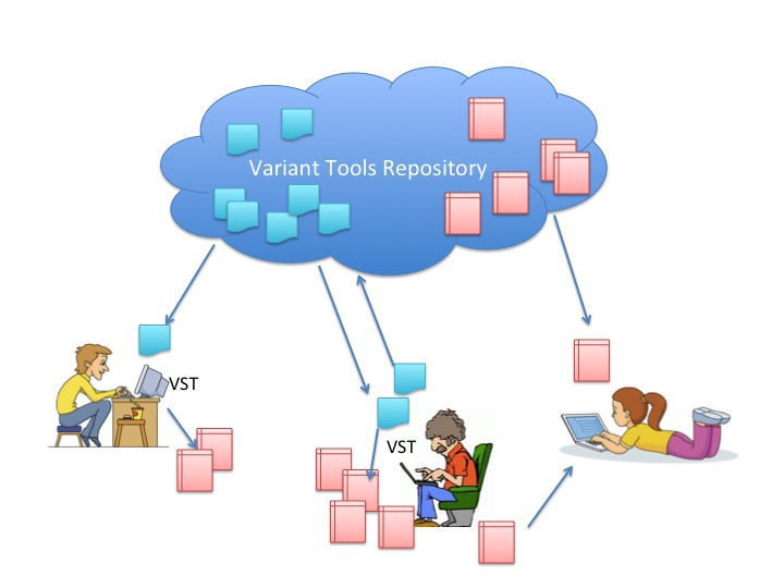 VST uses a two-tier design. The core of VST is a set of functions to perform different tasks and is distributed with Variant Tools. Simulations are defined in simulation specification files that are stored in the variant tools repository. New simulations become available to all VST users as soon as they are uploaded to the repository.
